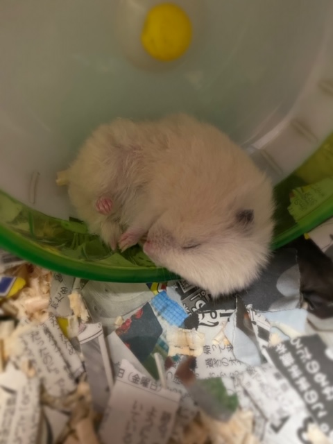 回し車の中で寝ちゃうなんて動きまわって疲れたのかな?